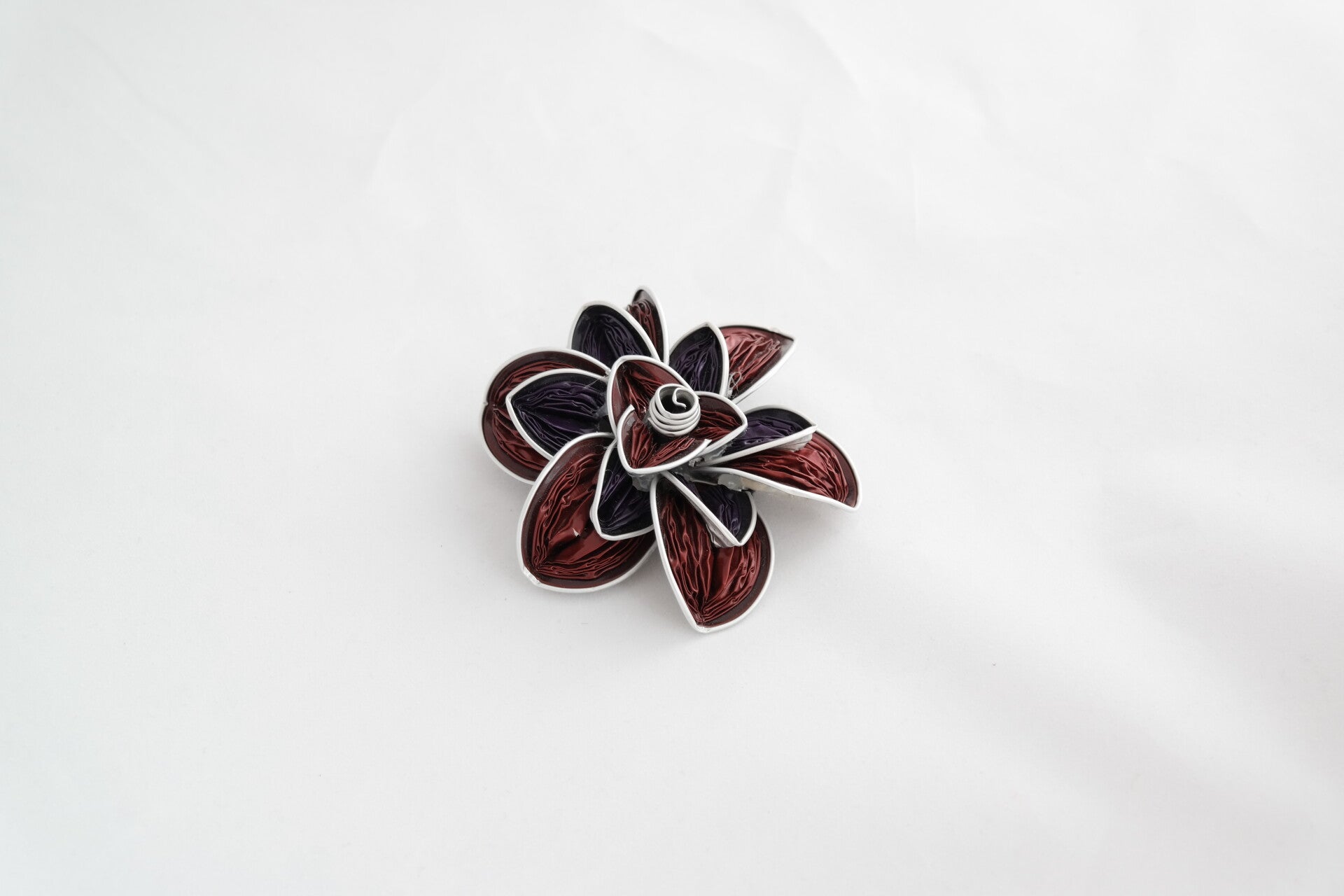 een rood, paarse bloem met 6 bladen. dit zorgt voor een symetrisch effect en dat is erg mooi voor op een pak of jurk.